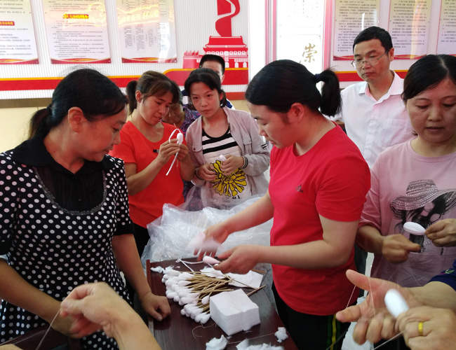 為了讓更多貧困人口能夠就近就業(yè),實現(xiàn)穩(wěn)定增收,促進企業(yè)對貧困村的幫扶,2019年6月18日下午,安慶市嘉欣醫(yī)療用品科技股份有限公司開展了 百企幫百村"精準扶貧行動,生產(chǎn)部經(jīng)理陳迎貴帶領(lǐng)車間技能能手去眉山村實施技能扶貧,對群眾進行一對一,手把手,面對面的培訓。嘉欣醫(yī)療把就業(yè)培訓課堂搬到了群眾家門口。讓這些貧困人員掌握一技之長,從而來改變他們 等要靠"的思想!董事長汪秀春說:我們的精準扶貧就業(yè)以家庭為單位,實現(xiàn)一人就業(yè)全家脫貧。充分調(diào)動貧困人員的勞動積極性,貧困戶可以到村里報名,我們會根據(jù)他的實際情況,為他尋找合適的工作。實現(xiàn)企業(yè)、村集體、貧困戶互助多贏!